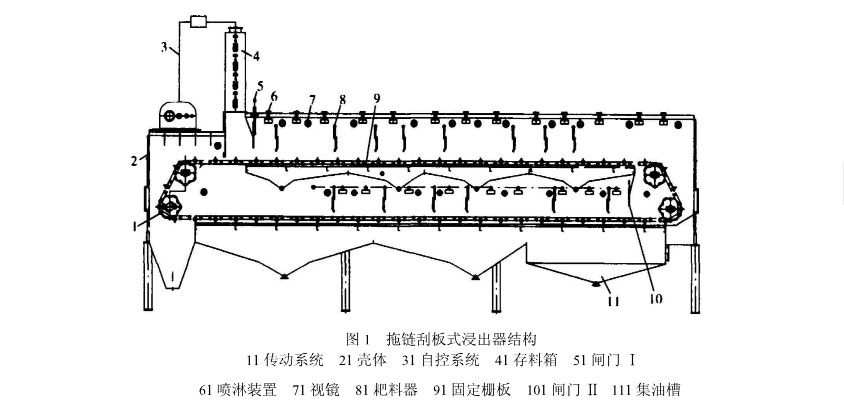 拖鏈刮板式浸出器結(jié)構(gòu)簡單運(yùn)行可靠、適應(yīng)性強(qiáng)、浸出率高,在設(shè)計(jì)、制造中要抓住其要點(diǎn),明了運(yùn)行中應(yīng)注意的問題。根據(jù)生產(chǎn)實(shí)踐,在浸出大豆坯時(shí),可使粕中殘油達(dá)到0.16 %~0.18 %。