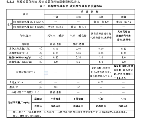 壓榨成品菜籽油、浸出成品菜籽油都是經(jīng)過精煉油設(shè)備精煉之后的通過質(zhì)量檢測認(rèn)證的可食用的菜籽油,上面圖片標(biāo)準(zhǔn)是針對菜籽油的質(zhì)量指標(biāo),提供給大家參考